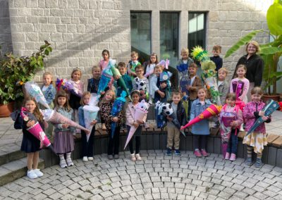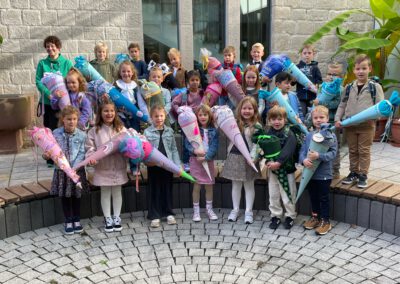 Am 16.September 2025 durften wir bei schönem Wetter drei neue Einschulungsklassen in unserem Pausenhof begrüßen. Laura Klement begleitete die Lieder mit der Gitarre, während die 2. Klässler unsere Schulanfänger willkommen hießen. Gemeindereferentin Isabella Friedrich nahm ihnen die Aufregung, stimmte die Kinder auf das Schulleben ein und segnete sie. Unser ehemaliger Rektor Günther Geiling hielt den besonderen Anlass in Bildern fest. Danach durften die „Neuen“ mit ihren Klassenlehrerinnen direkt in die Klassenzimmer und in ihr Schülerdasein starten. Dort ging es mit viel Spaß an die Arbeit. Es gab sogar bereits eine kleine Hausaufgabe.